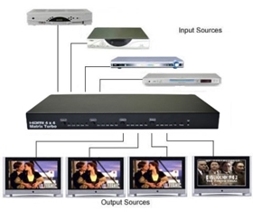 Uma matrix switcher HDMI permite múltiplas fontes para serem conectadas e distribuídas a vários monitores. Ela permite que qualquer combinação de fontes de entrada seja transferida para a tela. Por exemplo, uma matriz de 4x4 HDMI permite que quatro fontes HDMI sejam conectadas a 4 TVs em alta definição. A tabela a seguir ilustra as combinações de comutação de uma matrix HDMI.