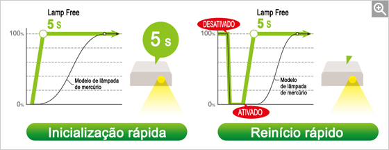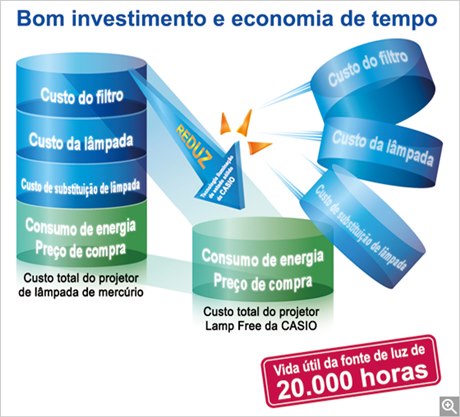 Através do comparativo abaixo, é possível constatar a economia realizada na aquisição de projetores sem lâmpadas: além do preço de um projetor de lâmpada de mercúrio e seu consumo de energia, também implicam custos adicionais como aquisição e substituição da lâmpada e do filtro.